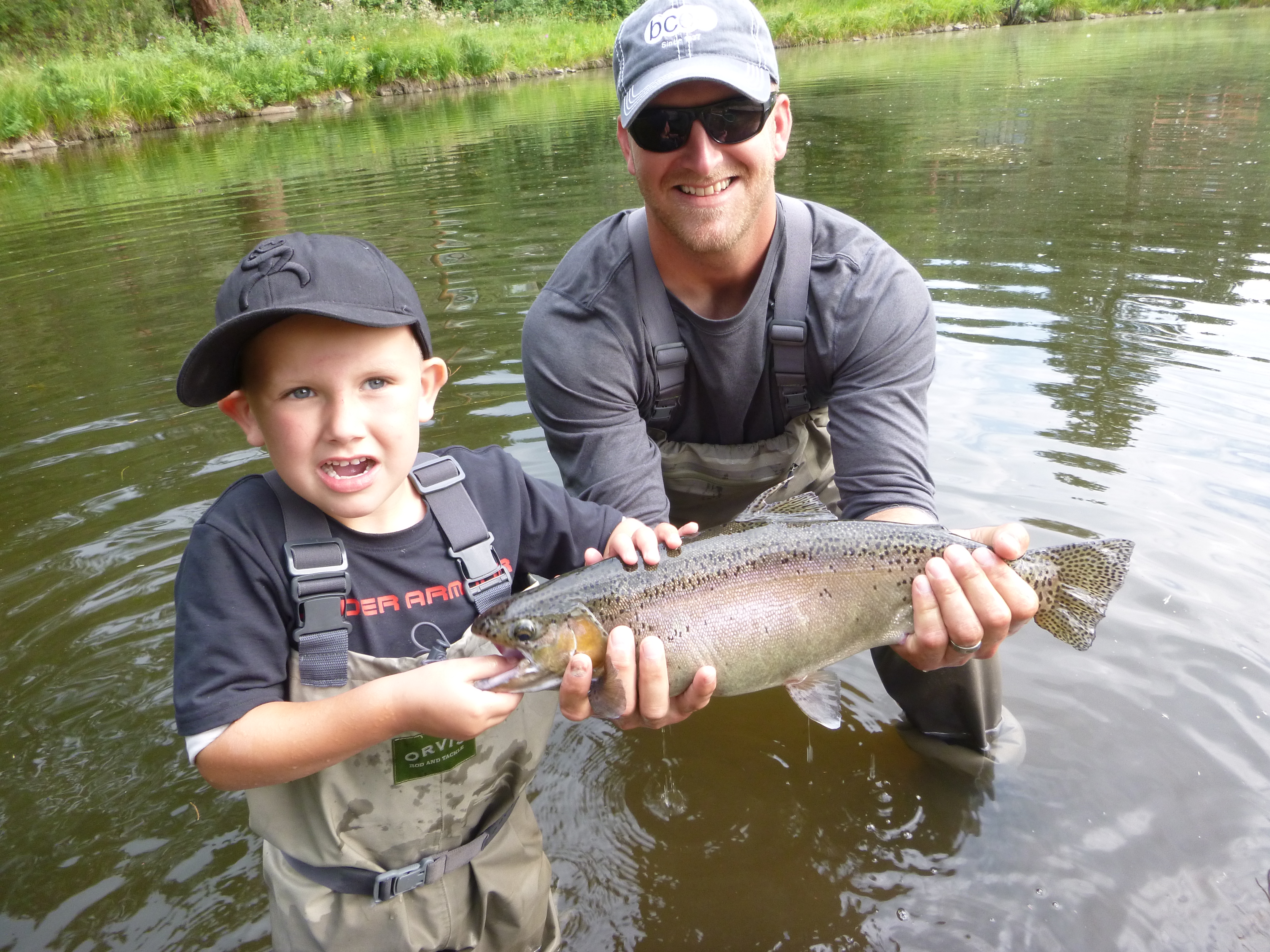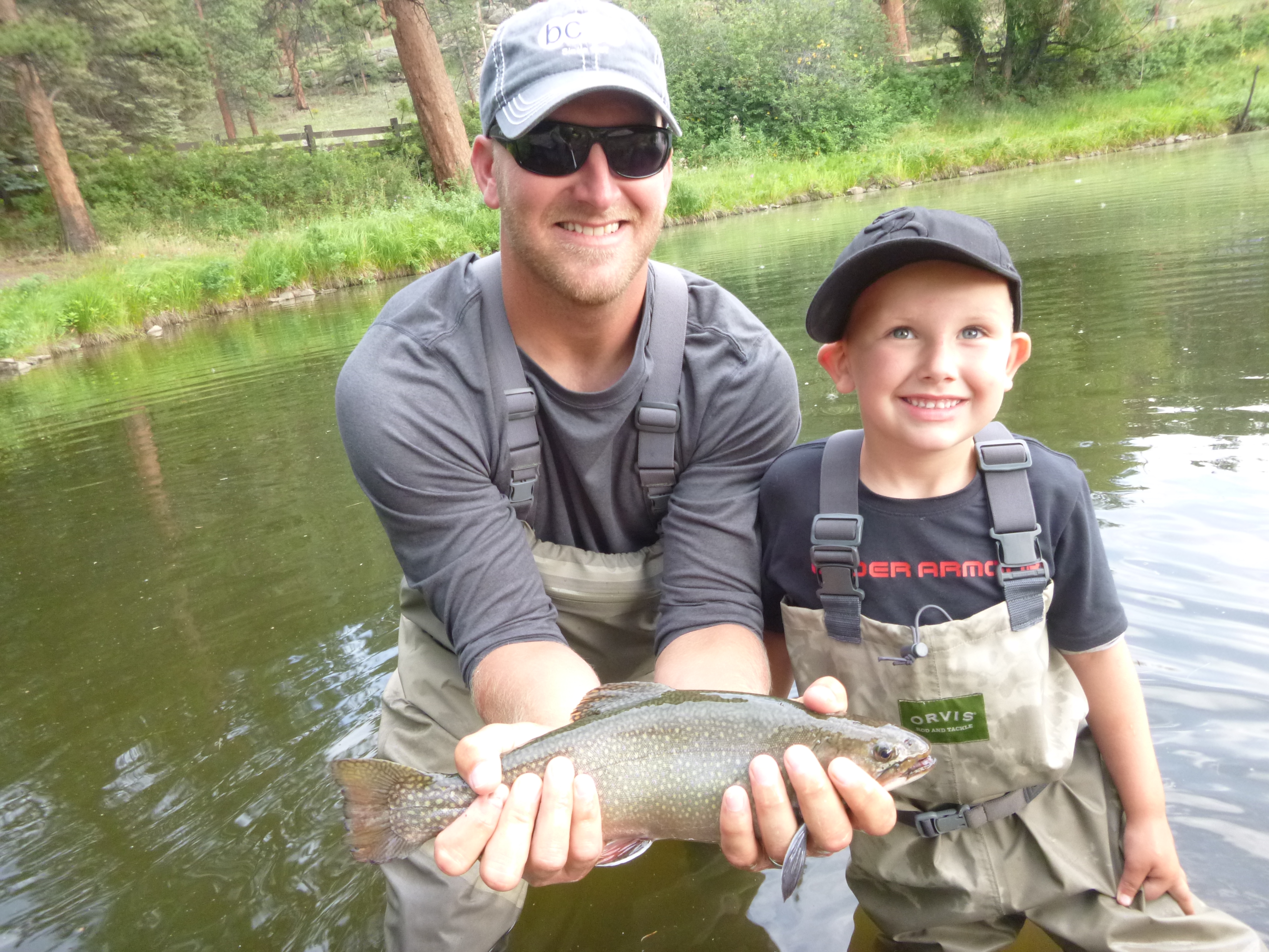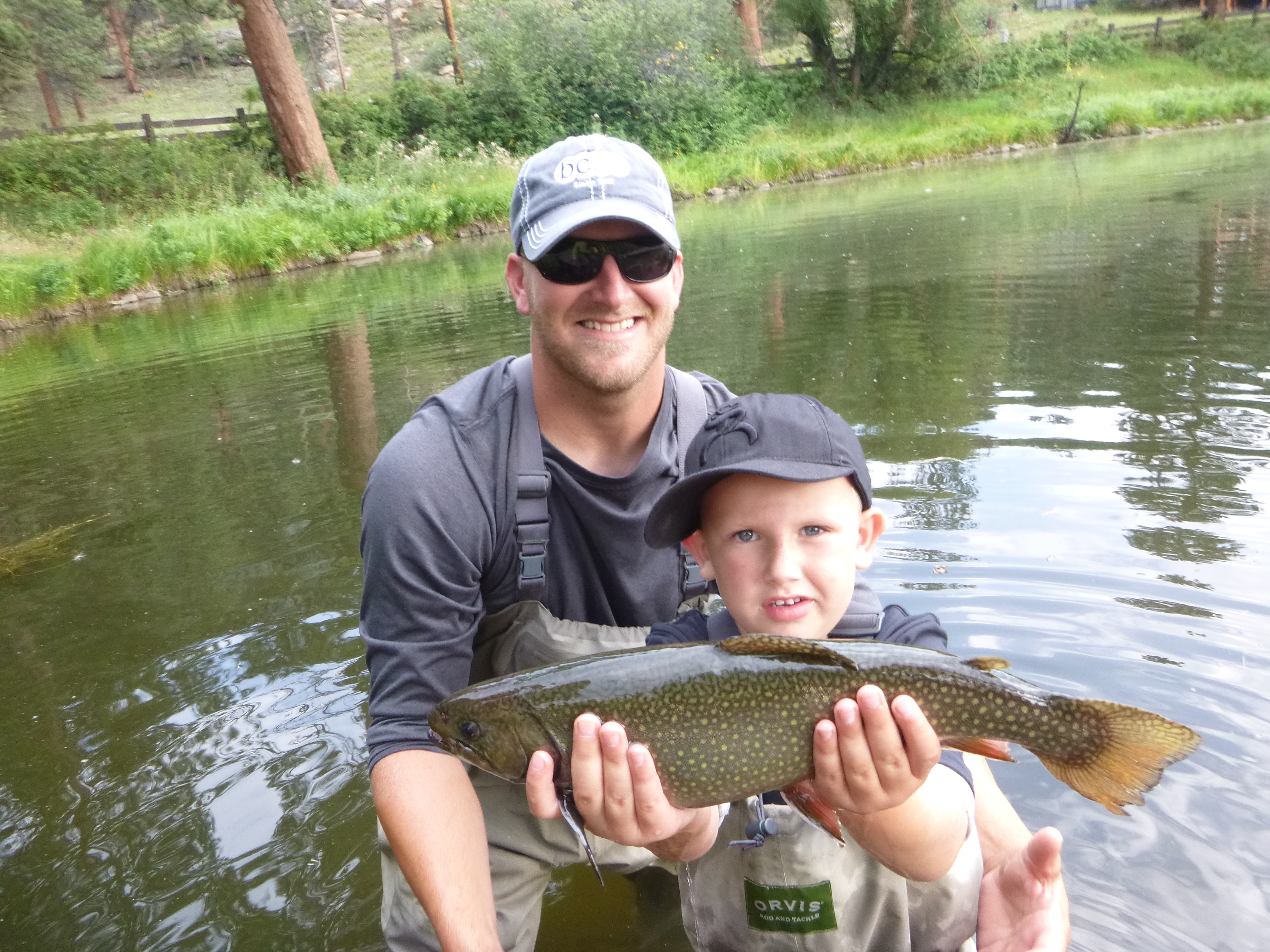 TJ is a pig farmer from Missouri who brought his 4 year old son Troy out to catch some fish. We started out at the tailwater of the Big Thompson River, but had a difficult time with the technicality of nymph fishing a difficult section of river. We went onto the pond where Troy reeled in some mighty big fish. We caught the full spectrum of trout that the pond offered rainbows, browns, and brook trout.